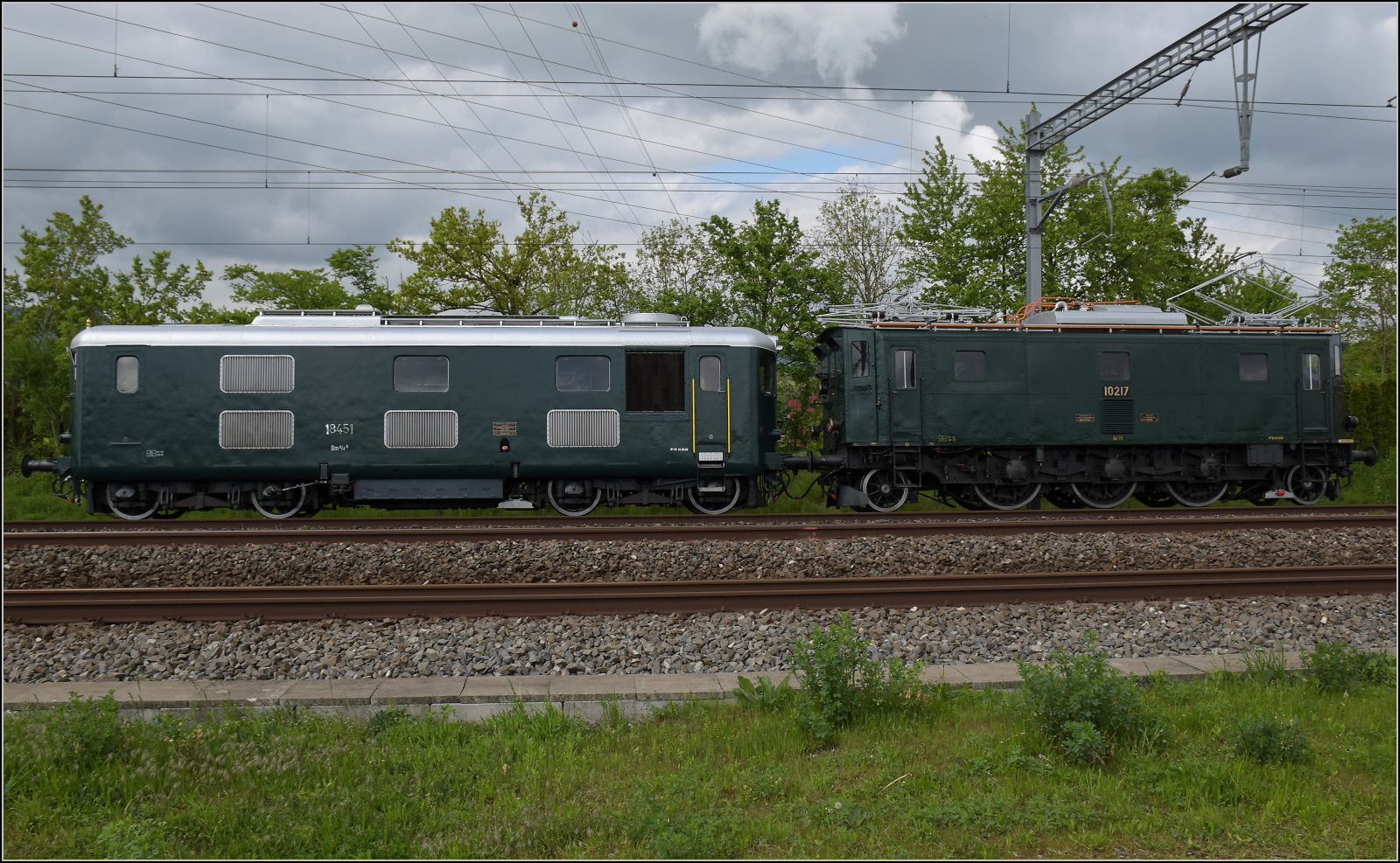 Zum Fest 150 Jahre Nationalbahn durfte Bm 4/4 II 18451 nach einer kleinen Ewigkeit von 10 Jahren endlich wieder an die frische Luft und wurde von Ae 3/5 10217 an ihren früheren Einsatzort nach Etzwilen gebracht. Hier in Wildegg, April 2025.