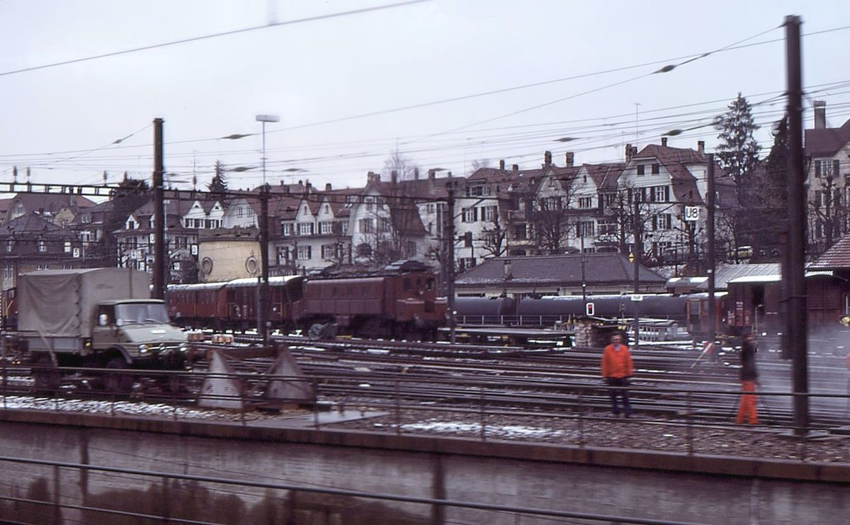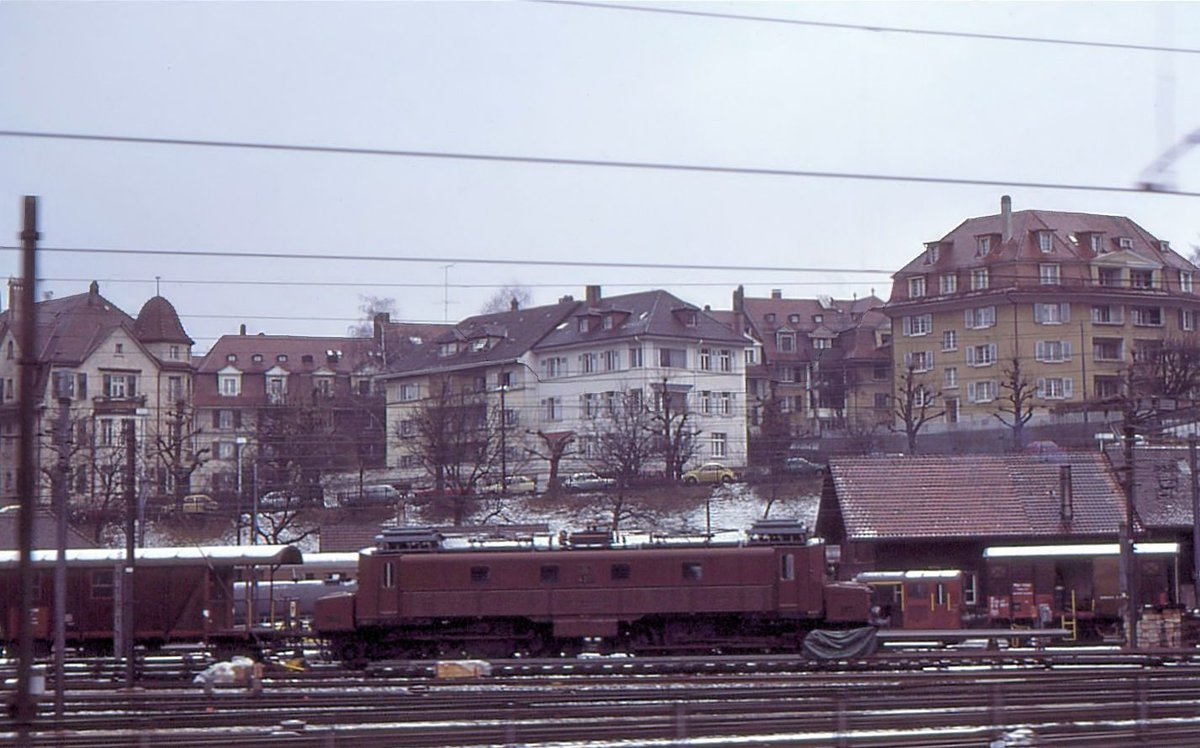 So stand die Ce6/8 I 14201 jahrelang beim Depot Bern. Doch nur einmal machte ich eine Aufnahme, leider in der Dunkelheit und aus einem vorbeifahrenden Zug. So oft hat man früher gedacht, die Dinge blieben ewig so wie sie sind, also wozu festhalten?  4.März 1981.