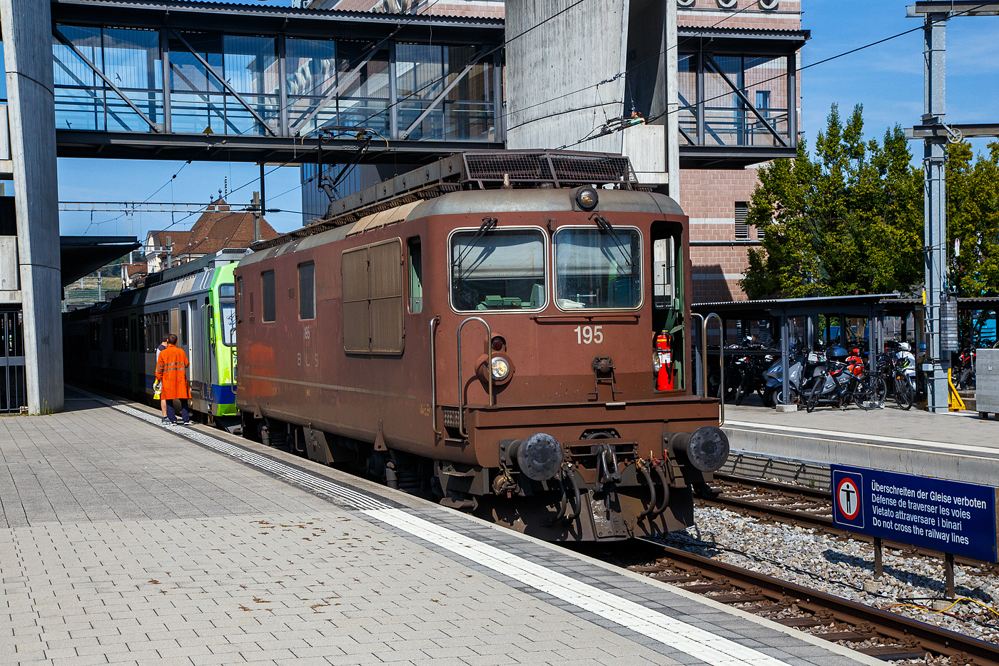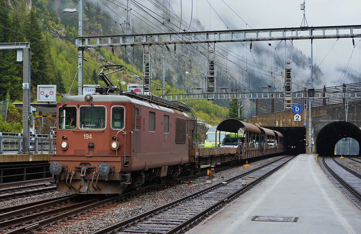 Die BLS Re 4/4 168 und 165 mit einem Güterzug oberhalb von Wassen auf der Gotthard Nord-Rampe.