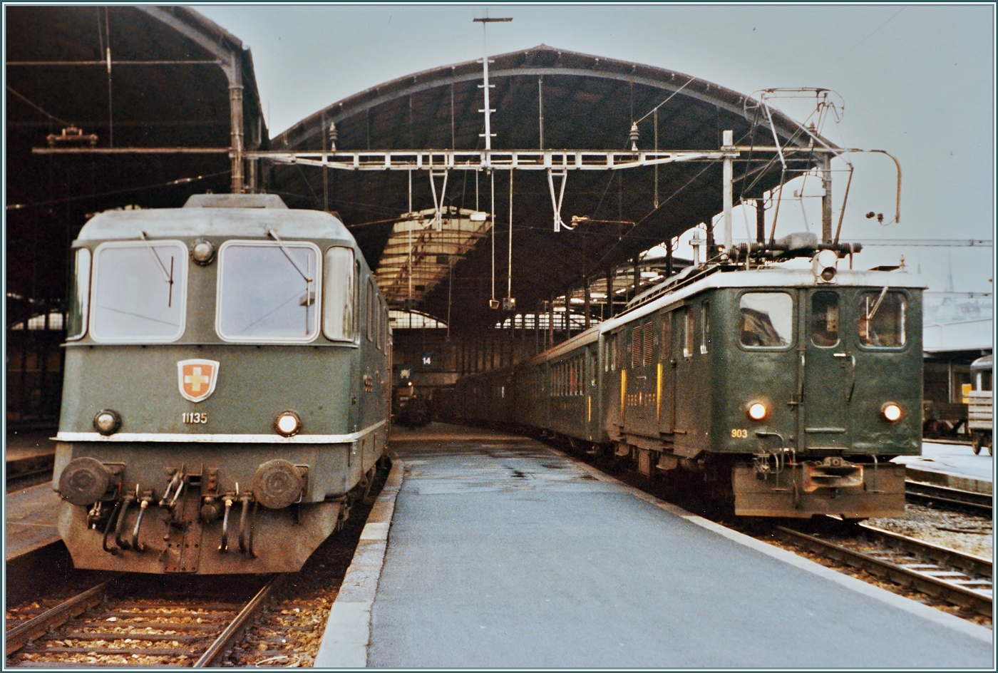 "Gross und Klein" lautet der wenig aussagekräftige Text in meinem Fotoalbum; in Luzern warten die SBB Re 4/4 II 11135 und der SBB Brünigbahn Deh 4/6 903 mit ihren Zügen auf die Abfahrt. Analogbild vom 25. Dez. 1985