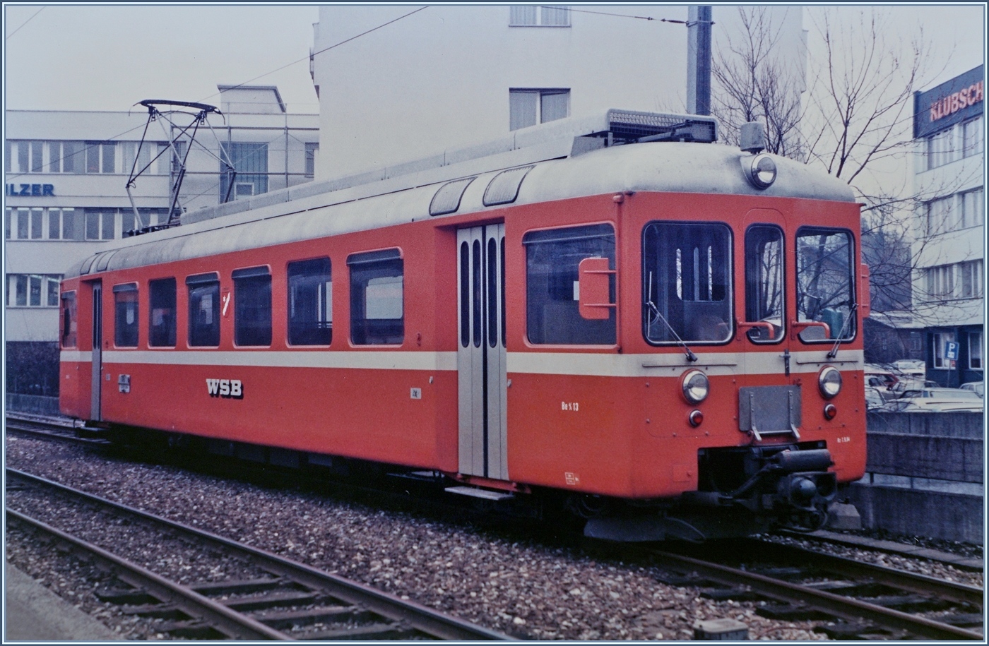 Der WSB Be 4/4 13 "Leimbach" in Aarau WSB. Die Triebwagen Be 4/4 9 - 14 wurden 1965 in Dienst gestellt. Analogbild vom März 1985