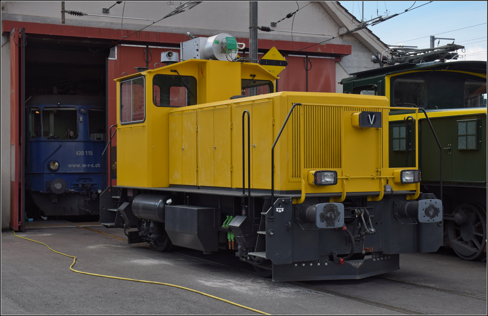 Ein Rangiertraktor oder gar Streckenlok für den Baudienst steht vor der Werkstatt in Balsthal. Die Bauart ist mir nicht bekannt, eine Nummer war (noch) nicht angebracht. Er scheint verwandt mit den Rangiertraktoren der Armee, sowie dem ehemaligen Rangiertraktor bei SI Group in Pratteln zu haben. Dahinter in der Werkstatt ist Re 430 115 der WRS in Arbeit. die Frontfenster sind alle ausgebaut. Balsthal, April 2025.
