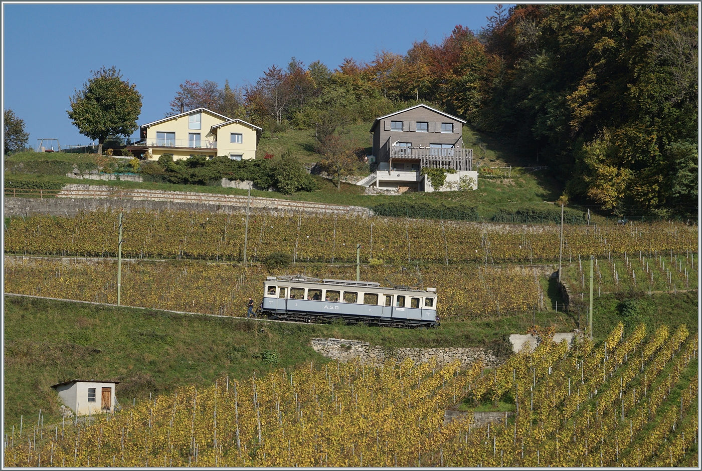 "Le Chablais en fête" bei der Blonay Chamby Eisenbahn. Die Eröffnung des ersten Teilstückes der Bex - Villars vor 125 Jahren, sowie die vor 80 Jahren erfolgte Fusion einiger Strecken im Chablais war der Anlass zum diesjährigen Herbstfestivals "Le Chablais en fête. Als besondere Attraktion zeigt sich der ASD BCFe 4/4 N° 1 "TransOrmonan" der TPC mit seinem B 35 als Gastfahrzeug. Das Bild zeigt den 1913 gebauten und 1940 umgebauten BCFe 4/4 N° 1 bei der Abfaht in Chamby.