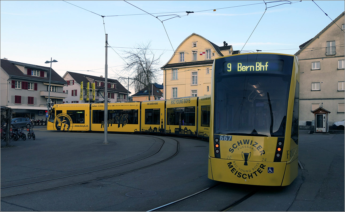 Mit Peter unterwegs in Bern - An der Wendeschleife Wabern steht Combino Classic 667. Durch die Krümmung des Zuges in der Schleife ändert sich die Beleuchtung des gelben Tram in der tiefstehenden Sonne.