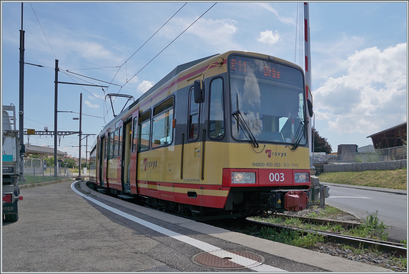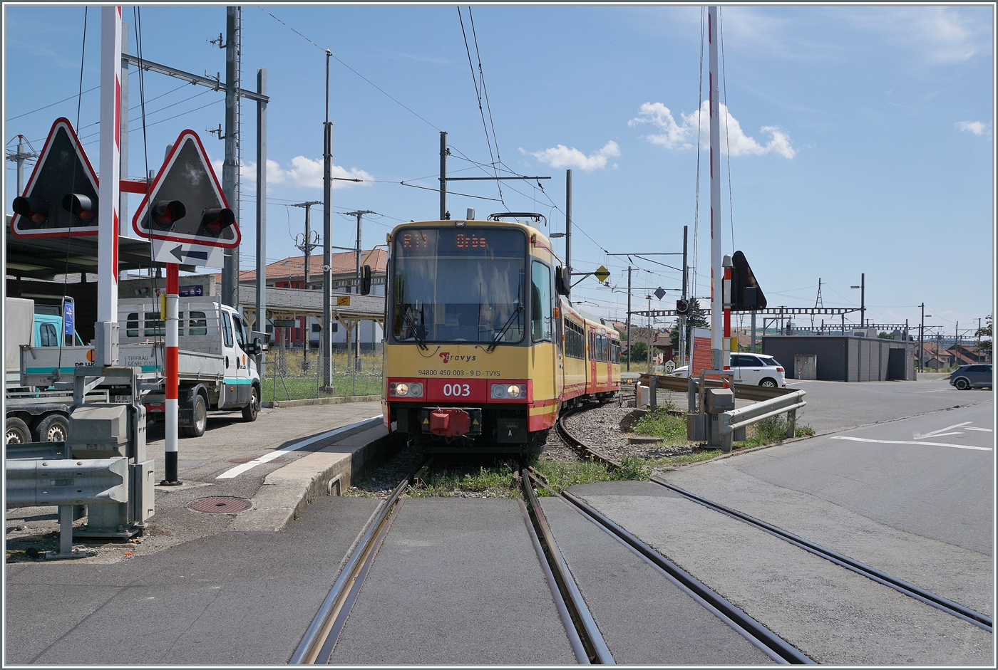 Der Be 4/8 N° 3 (94800 450 003-9 D-TVYS) aus Orbe in Chavornay angekommene wendet hier und wartet auf die baldige Rückfahrt nach Orbe. Der Gleichstromteil des Bahnhofs von Chavornay ist recht klein, und der in der Kurve stehende Triebwagen deshalb nicht ganz einfach zu fotografieren.