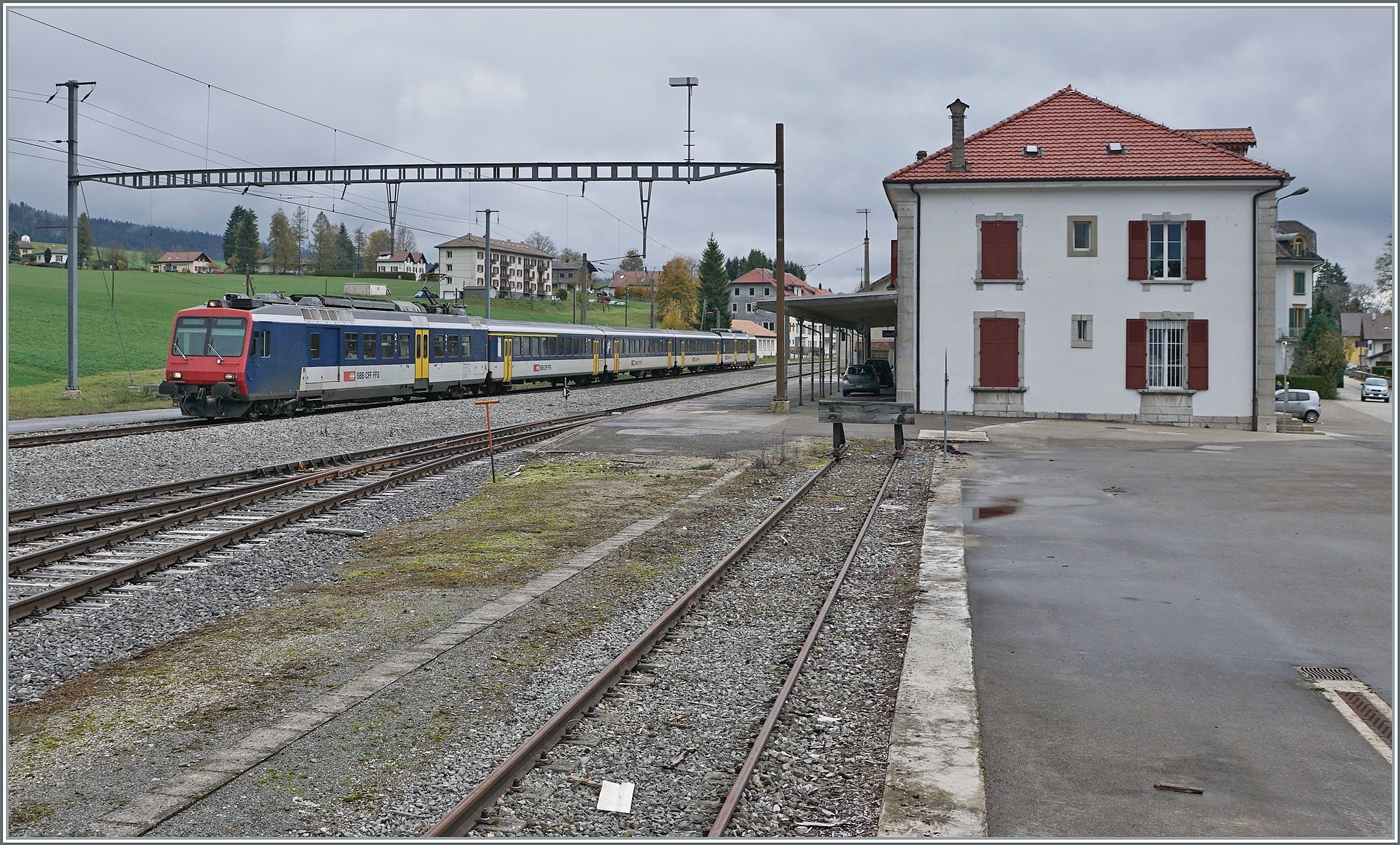 Für Ollis hervorragendes Bild des Integra Stellwerks von Les Verrières hier noch ein Zug dazu: Der RE 18124 auf der Fahrt von Neuchâtel nach Frasne fährt ohne Halt durch den Bahnhof von Les Verrières in Richtung Grenze. 29. Okt. 2019