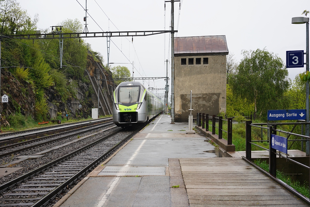 BLS 185 steht bei der Autoverladerampe in Kandersteg am 1 Jänner 2025 -jeder 10 Minuten treft ein Autoverladezug aus Goppenstein in Kandersteg ein, bzw verlasst ein solcher Zug Kandersteg nach Goppenstein.