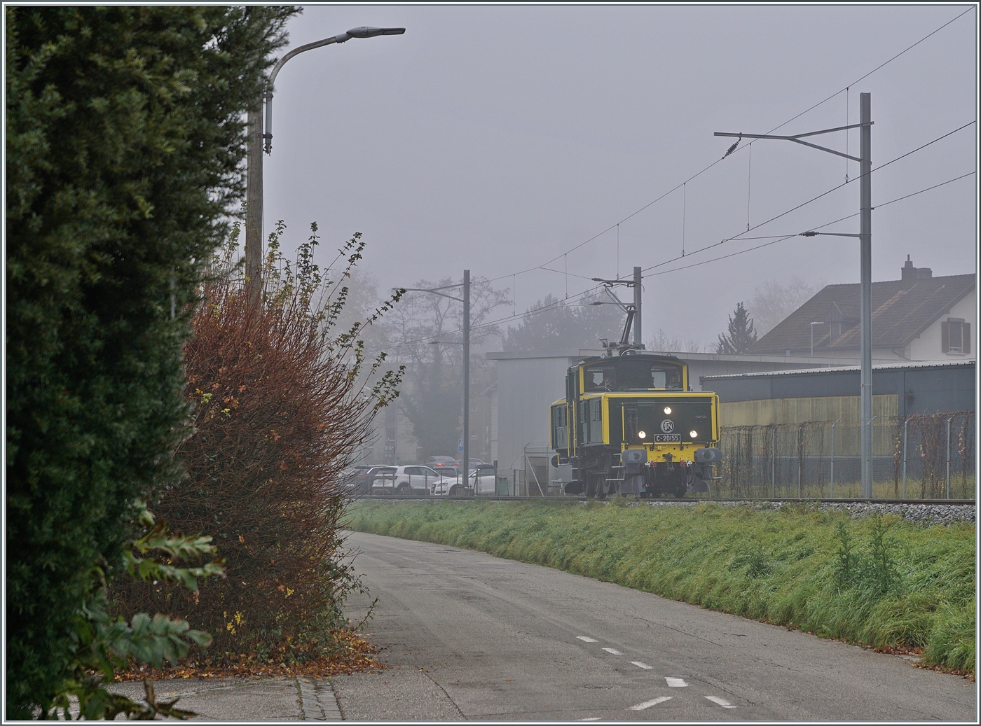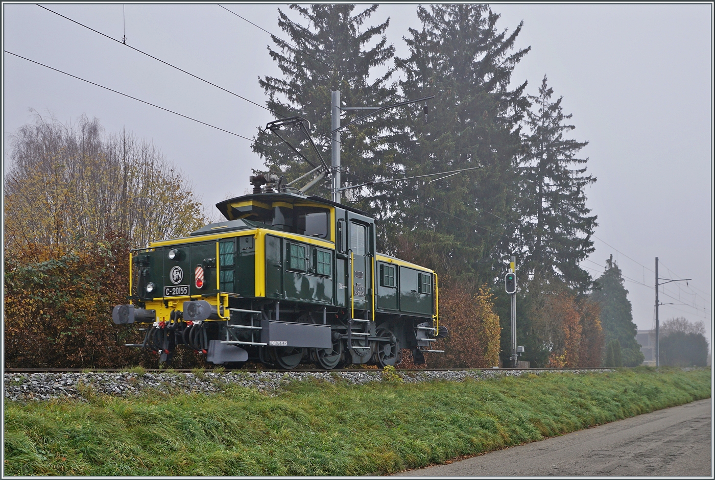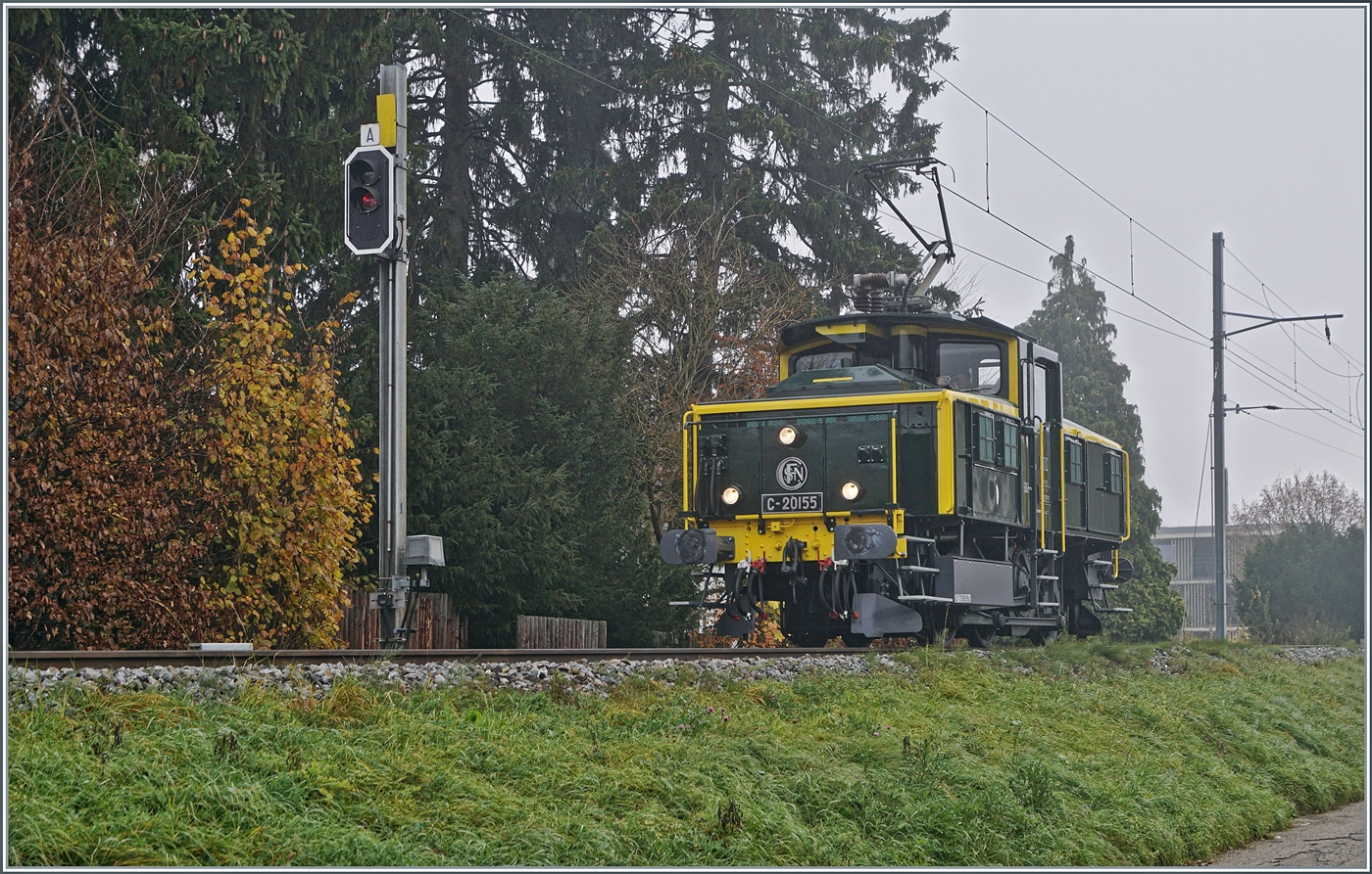 Die SNCF C 20155 UIC N° 97 85 1 932-0 (ex SBB Ee 3/3 II 16515, ex SNCF C 20155) des Verein "Team C-20155" kehrt als "Führerstandsmitfahrt" von der Klus zurück und konnte zwischen Thalbrücke und Balsthal fotografiert werden. 8. November 2025