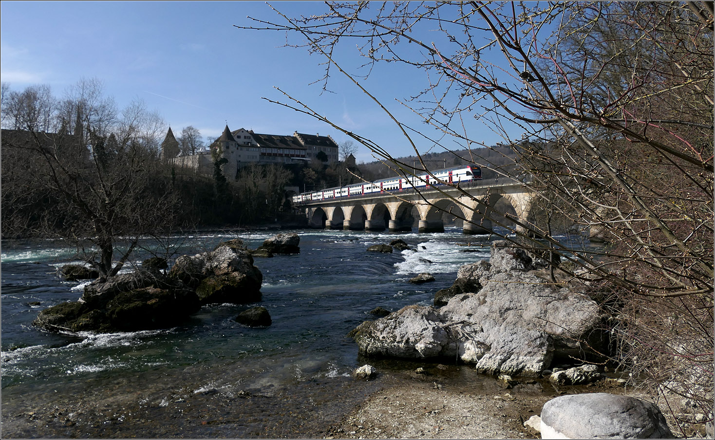 Ein bekanntes Motiv: die Rheinbrücke der Strecke nach Winterthur mit dem Schloss Laufen am Rheinfall. Hier nahm ich die Zweige vor der roten Front, die eh im Schatten liegt in Kauf um die S-Bahn in stimmiger Position auf der Brücke platzieren zu können.