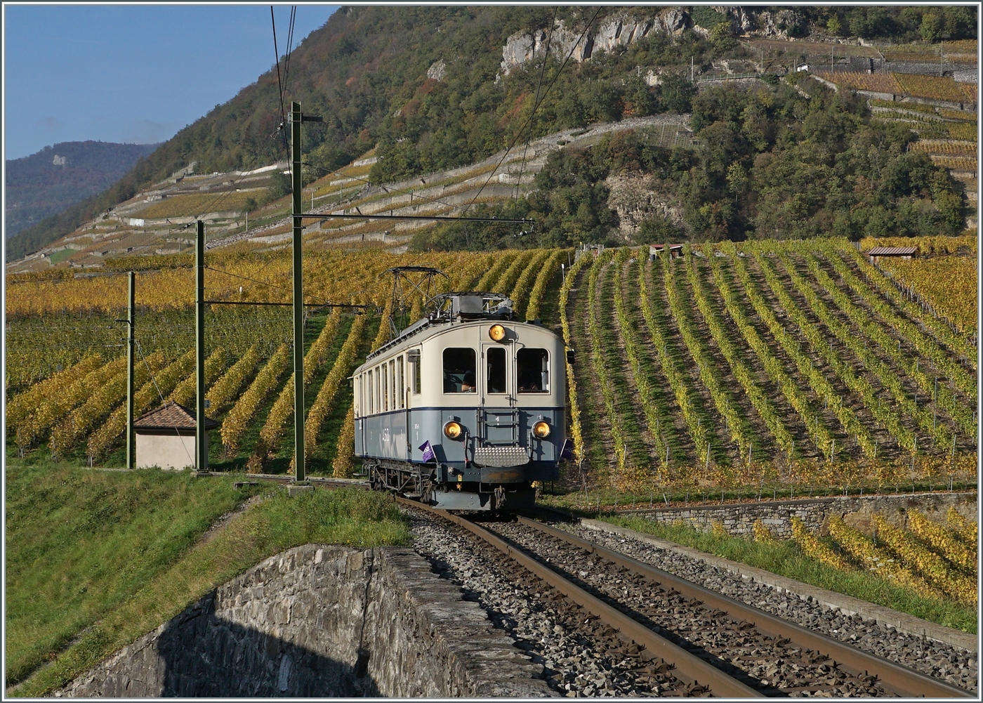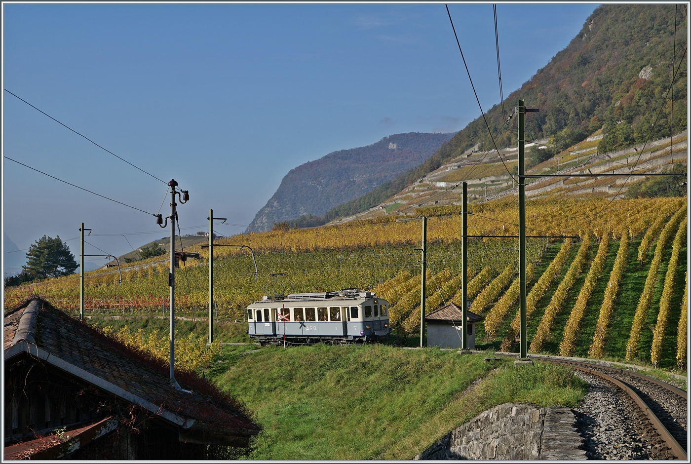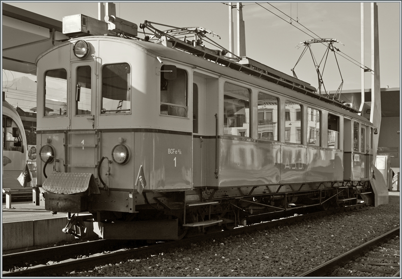 Ein Blick auf die beiden BCFe 4/4 N° 1 und BDe 4/4 N° 2 der ASD bzw. der Association ASD 1914. Leider nicht ideal, aber die einzige Möglichkeiten die beiden aus der Anfangszeit der ASD stammenden Triebwagen gemeinsam aufs Bild zu bekommen.