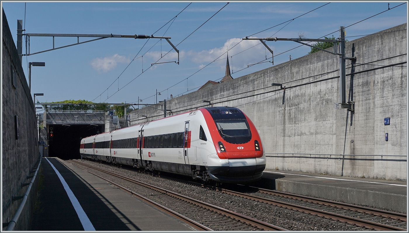 Der IC5 1521, bestehend aus den beiden SBB ICN RABDe 500 023 Charles Ferdinand Ramuz  (Spitze) und RABDe 500 018  Adolf Wölfli  (Schluss) fährt mit hoher Geschwindigkeit durch den Bahnhof von Concise. Der IC 5 1521 ist auf dem Weg von Lausanne nach Zürich HB. 5. Juli 2025