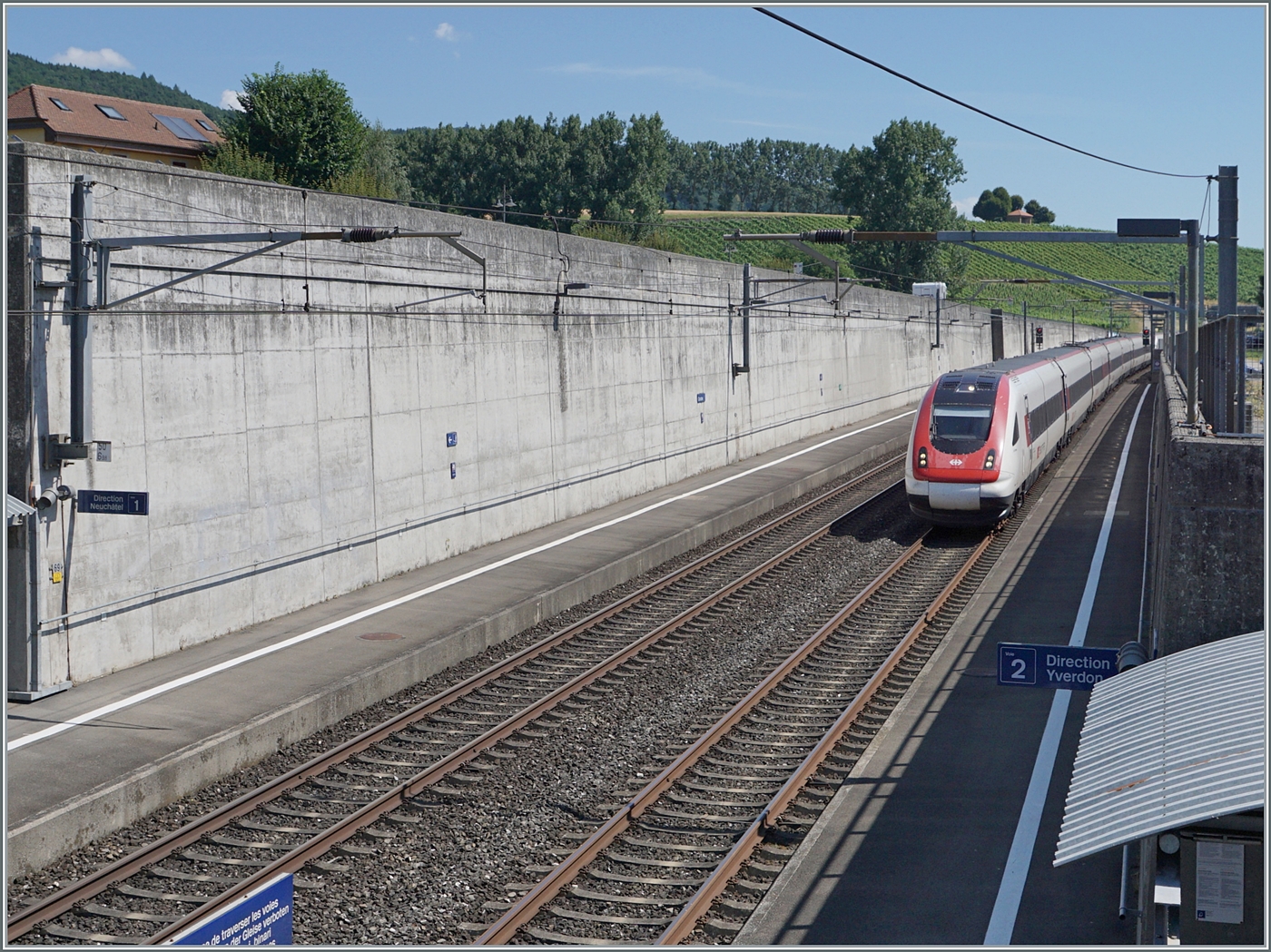 Dass es sich lohnt in Concise auszusteigen vermittelt auch dieses Bild: die unmittelbare Umgebung von Concise zeigt sich sehr lieblich, zudem liegt Concise am Neuenburger See, der hier vom linken Bildrand her gesehen nur wenige Meter entfernt ist. Zwei ICN RBDe 500 sind in Concise als IC5 auf dem Weg in Richtung Biel/Bienne. 5. Juli 2025