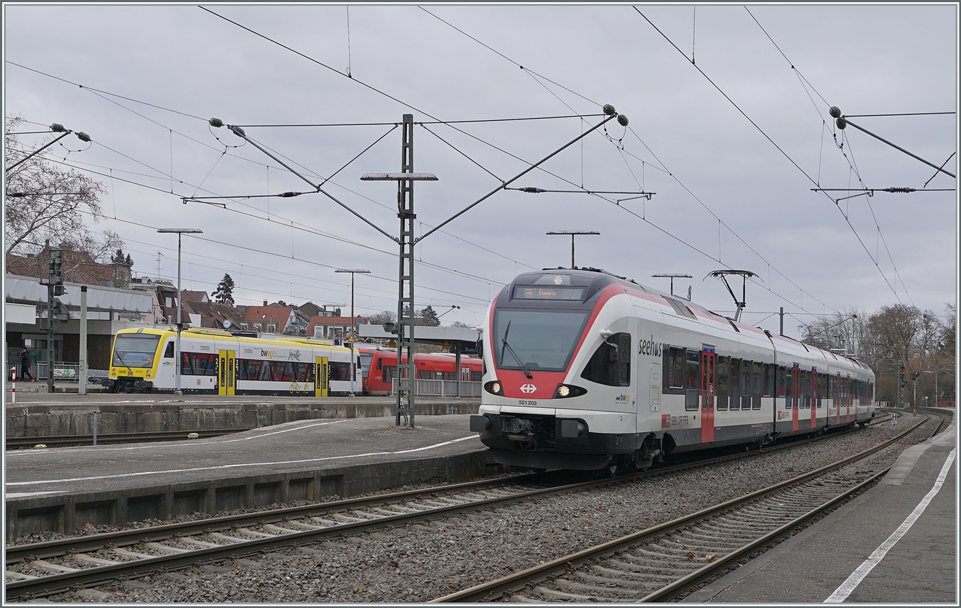 Seehas und Seehäsle in Radolfzell: Während der SBB RABe 521 203 als Seehas Radolfzell in Richtung Engen verlässt, warten im Hintergrund die beiden DB 650 023 und 650 115 als Seehäsle auf die baldige Abfahrt nach Stockach. 15. März 2025