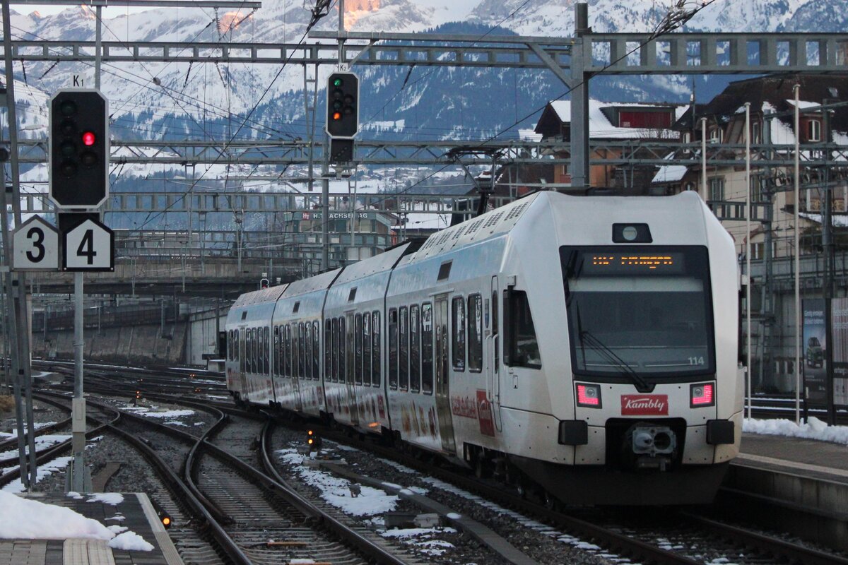 BLS 535 114 verlasst in Kambly-Farben Spiez am 1.Jänner 2025.