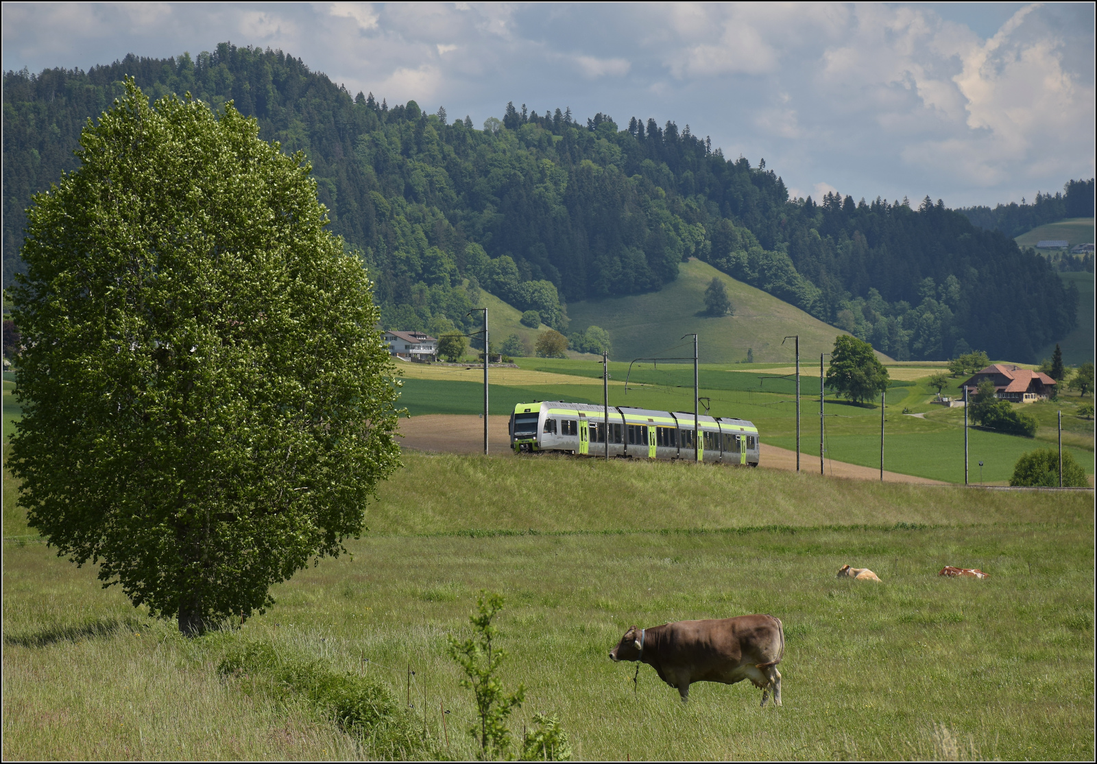 150 Jahre Emmentalbahn. Eng verwoben mit der Emmentalbahn (EB) war die Burgdorf-Thun-Bahn (BTB) ab ihrem Betriebsstart. Seit ihren ersten Tagen 1899 war die Elektrifizierung mit Drehstrom die grosse Besonderheit dieser Bahn. Dadurch war auch die Rampe von Konolfingen nach Grosshöchstetten (im Hintergrund) als grösseres Betriebshindernis für die Bahn besser im Griff. Im ersten Weltkrieg profitierte die Bahn von von der Energiekriese aufgrund ihrer nachhaltigen Energieversorgung. Der Strom wurde 1932/33 auf Einphasen-Wechselstrom umgestellt, aber das Prinzip des Drehstromantriebs beherzigt heute der Lötschberger Kollege RABe 535 121 intern, hier auf dem Weg nach Grosshöchstetten hinauf. 1942 wurde die BTB mit der EB zur Emmental-Burgdorf-Thun-Bahn (EBT) fusioniert, 1997 folgte der Zusammenschluss mit VHB und SMB zum Regionalverkehr Mittelland (RM), der wiederum 2006 in die BLS integriert wurde. Konolfingen Dorf, Mai 2025.