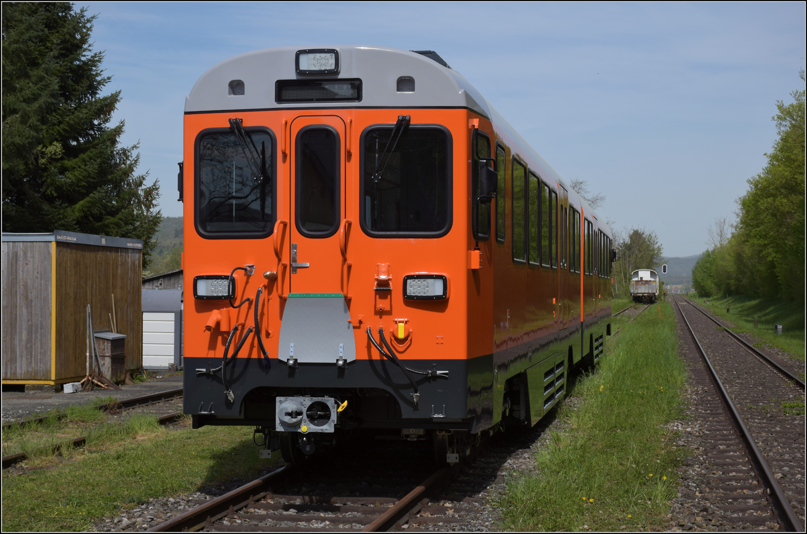 Der für das Werksgelände von Huawei in Südchina bestimmte, nigelnagelneue Bm 880 205 in Hemishofen mit der innen per Zettel angebrachten NVR-Nummer 99 85 8880 205-6. April 2024. Olli