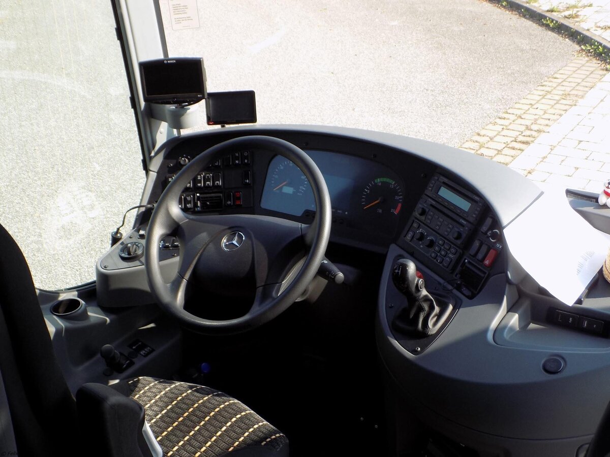 Der Fahrerarbeitsplatz eines Mercedes Tourismo von Becker-Strelitz Reisen aus Deutschland in Rostock.