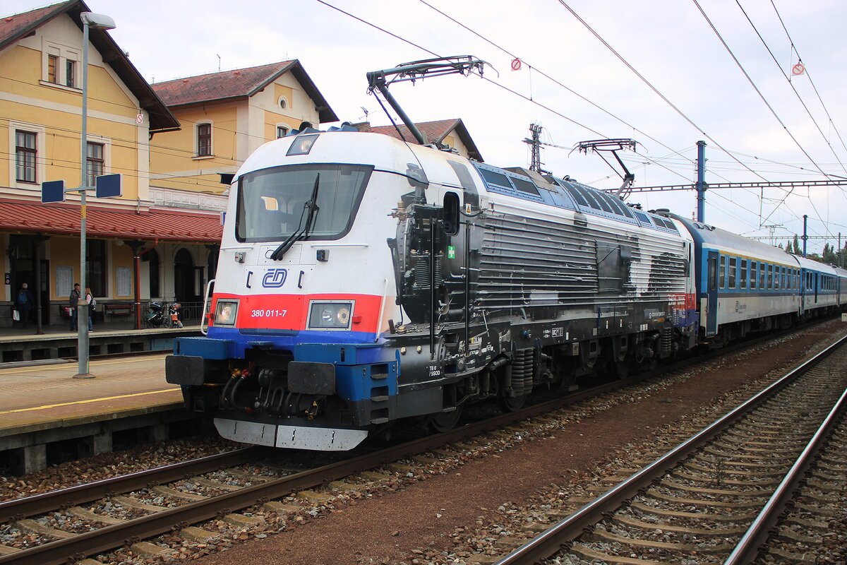 CD 380 013 treft mit ein EC aus Linz Hbf am 27 September 2025 in Benesov u Prahy ein.