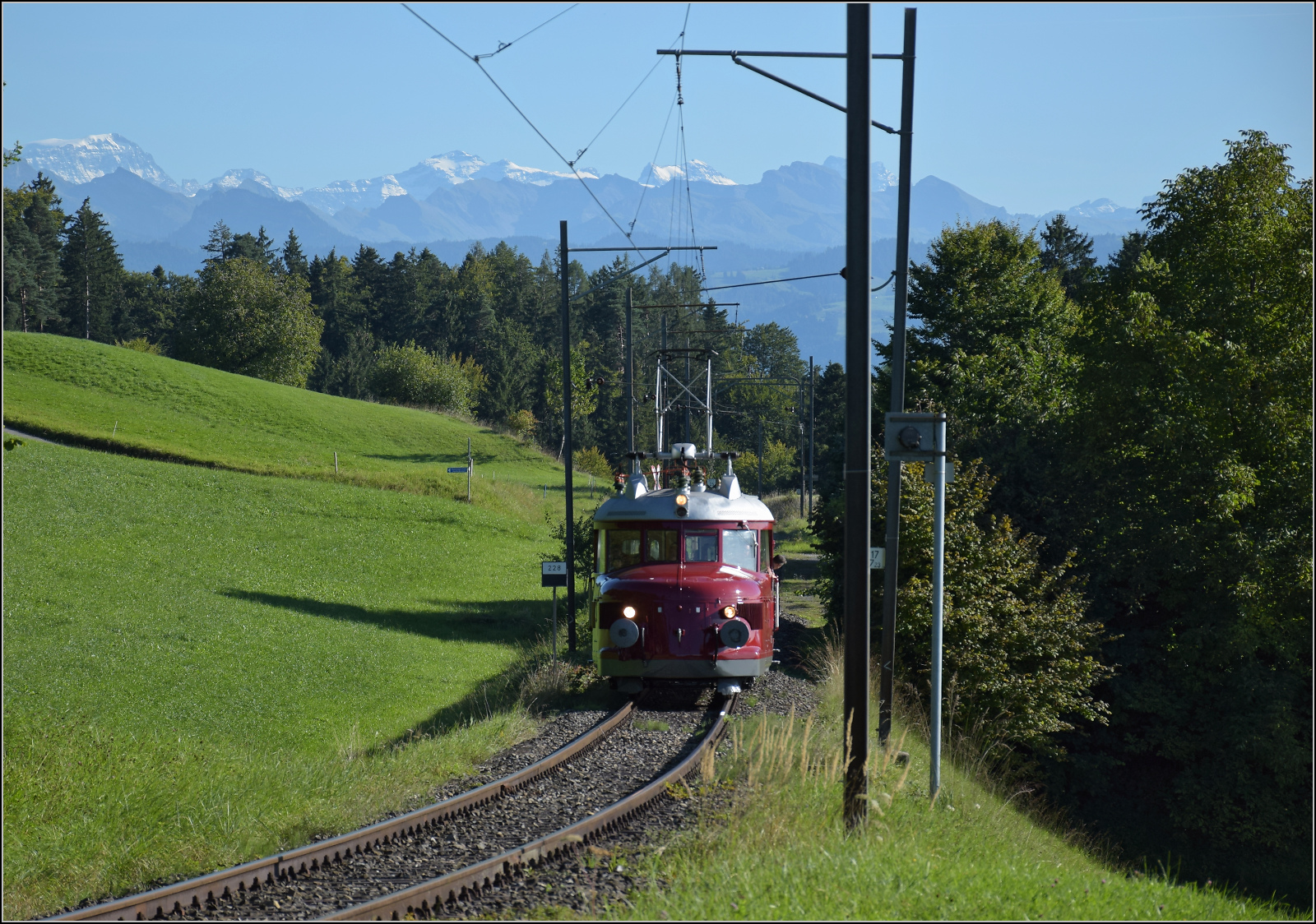 150 Jahre Tösstalbahn. Der Rote Pfeil aus Balsthal durfte beim Jubiläum mitfeiern. Nach dem Aussendienst auf der Kempttalbahn ging es für RCe 2/4 607 zur Übernachtung nach Bauma. Hier nahe des Haltepunks Ettenhausen-Emmetschloo. Im Hintergrund sind Tödi (3613 m), Clariden (3267 m) und der Chammliberg (3215 m) prominent im Bild. September 2025.